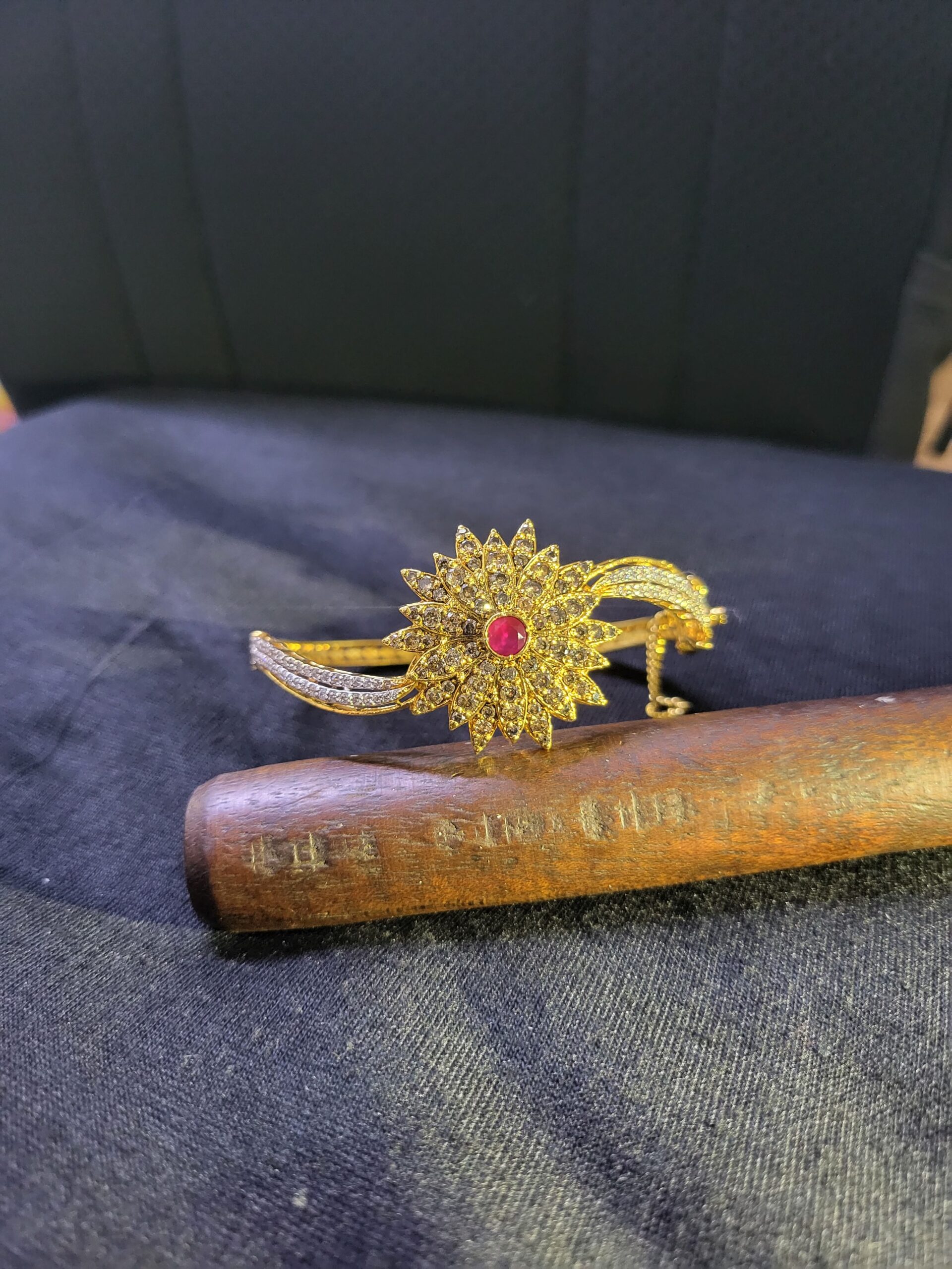 The Crimson Bloom Bangle by Big Jewellery is a masterpiece of intricate artistry and regal charm. Designed around a brilliant ruby-red central stone, the bangle blossoms outward in a sunburst floral design, each petal encrusted with fine clear zircons that shimmer with every movement.