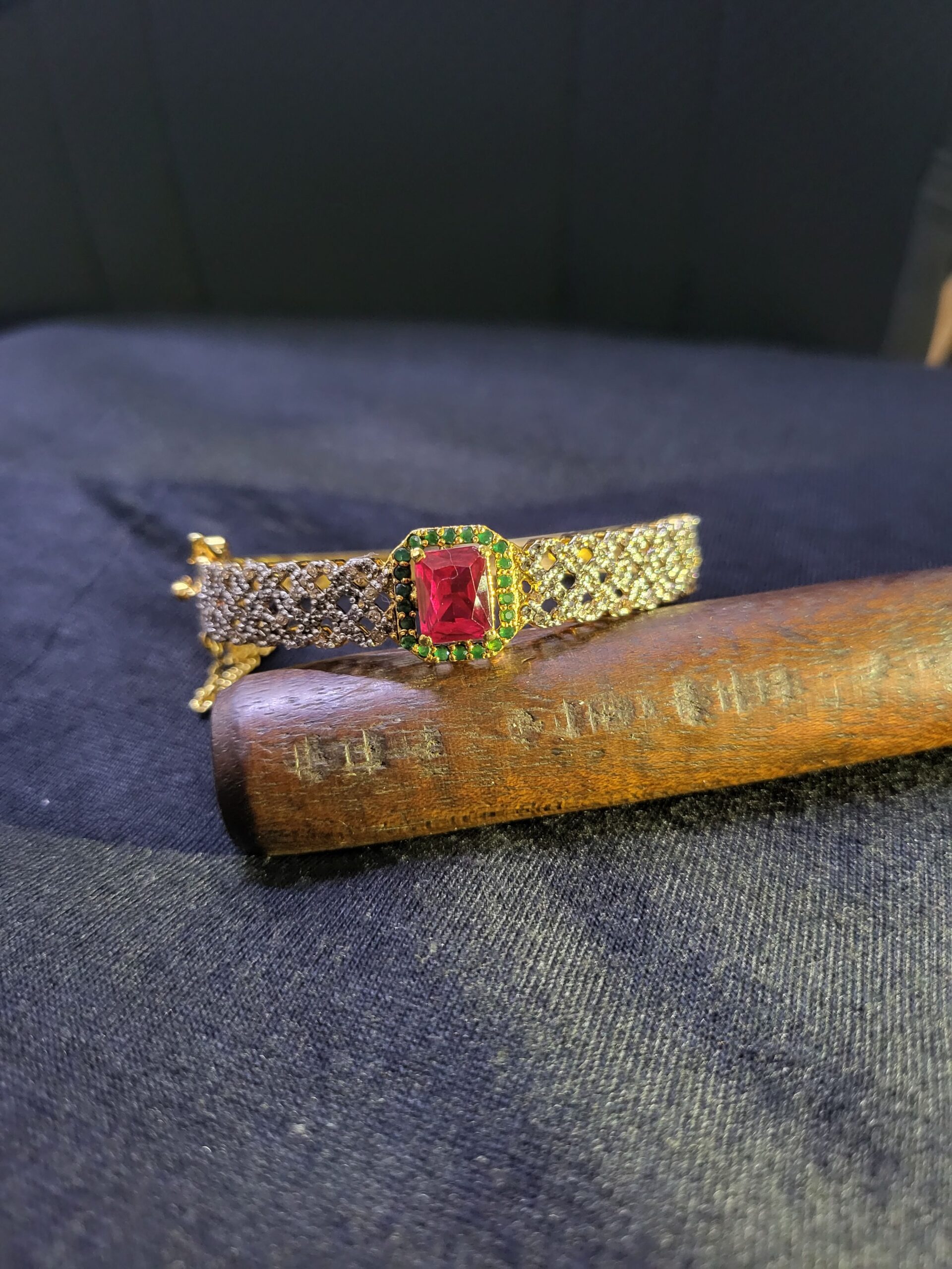 The Emerald Royale Bangle by Big Jewellery radiates imperial allure. Its centerpiece — a deep ruby gemstone — is embraced by a fine halo of emerald stones, adding contrast, character, and exquisite depth.