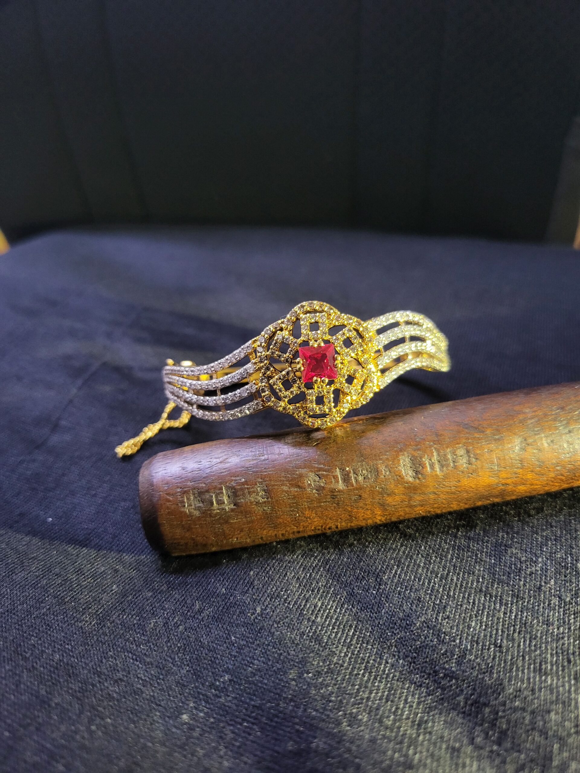 Expertly handcrafted in sterling silver and finished with 24K gold plating, the bangle’s multi-band structure offers both sophistication and strength. A true statement of luxury for weddings, soirées, and heirloom gifting.