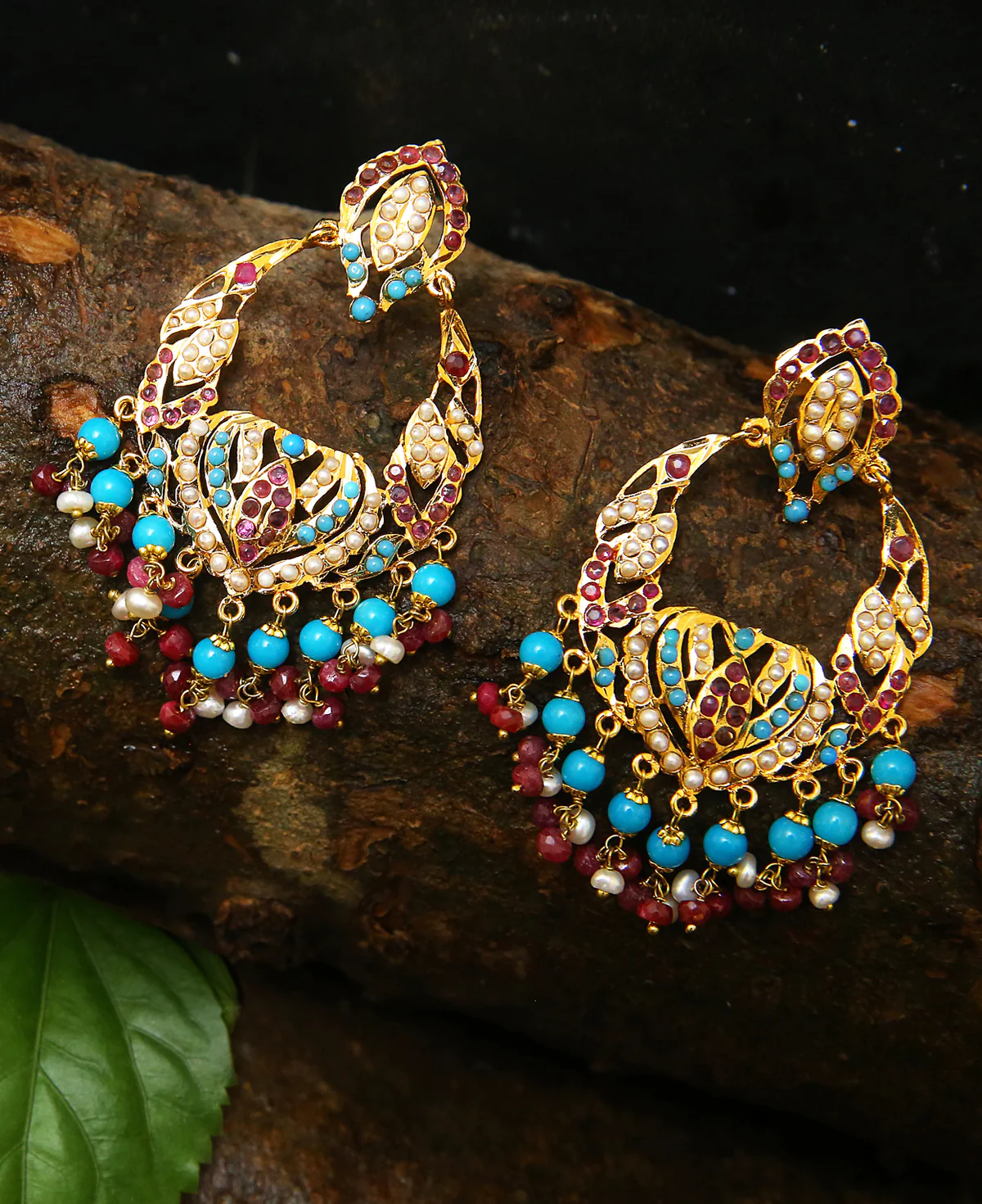 The unique color contrast of deep red rubies, sky-blue ferozas, and luminous pearls makes this pair a statement piece for weddings, festive events, and traditional celebrations. Each earring is adorned with hanging gemstone drops that sway elegantly with every movement, creating a touch of sophistication and grandeur.