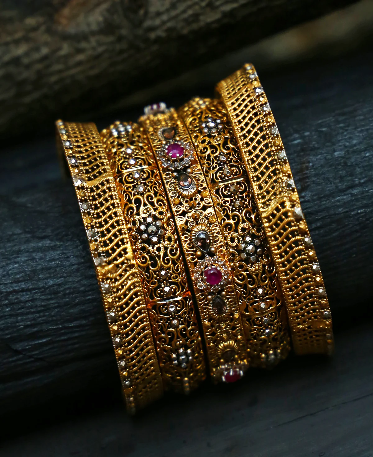 This regal set captures the allure of old-world elegance — perfect for bridal wear, festive occasions, or heirloom gifting. The bangles’ ornate texture and gemstone interplay radiate sophistication, making them a timeless addition to your luxury jewellery collection.