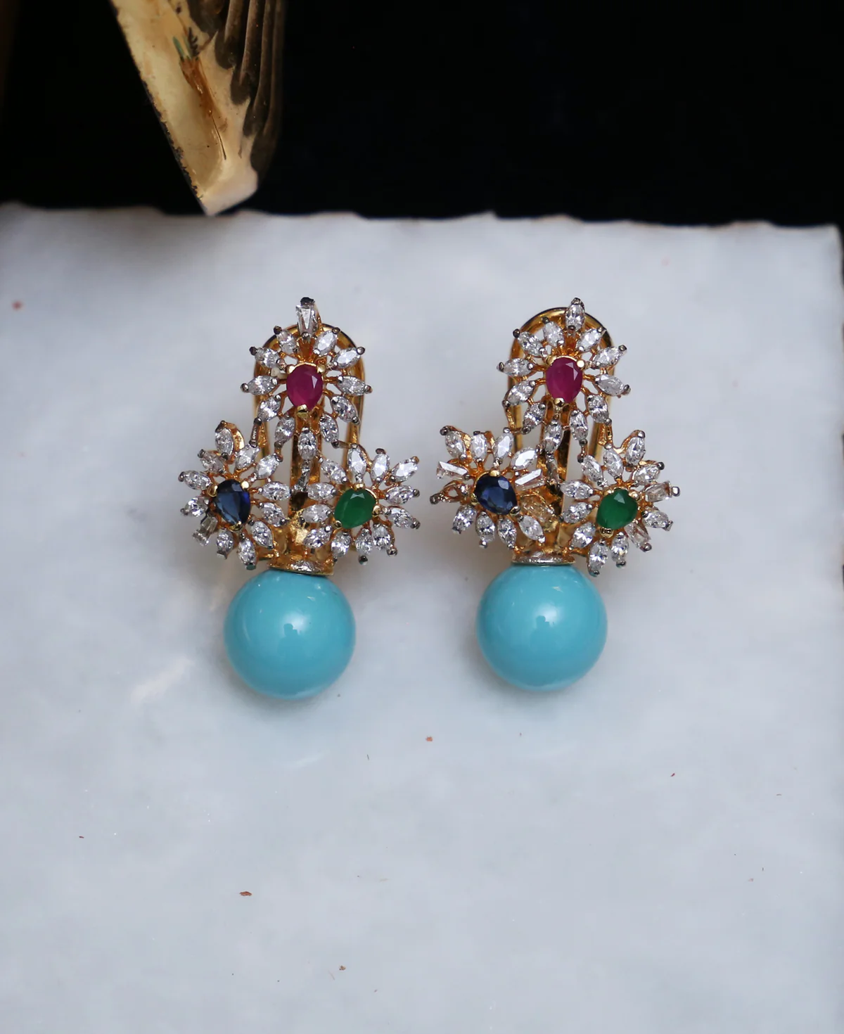The Tri Colored Smart Tops 2 by Big Jewellery are a true reflection of colorful elegance and modern craftsmanship. Handcrafted in sterling silver, these earrings showcase a trio of precious tones — treated rubies, jadeites, and blue zircons, arranged beautifully in a floral motif. A striking imitation turquoise bead drop adds a refreshing pop of color, giving these tops a youthful yet luxurious appeal.